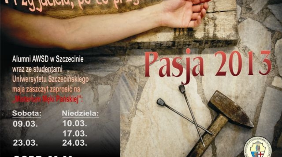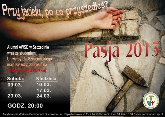Klerycy Arcybiskupiego Wyższego Seminarium Duchownego oraz studenci Wydziału Teologicznego Uniwersytetu Szczecińskiego jak co roku, mają zaszczyt zaprosić na Misterium Męki Chrystusa. Odbędzie się ono w kościele seminaryjnym mieszczącym się przy ul. Papieża Pawła VI nr 2. Daty oraz godzina przedstawienie znajdują się na zamieszczonym plakacie.