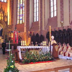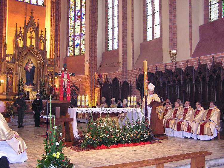 Słowo Boże wygłosił pasterz sąsiedniej diecezji koszalińsko-kołobrzeskiej bp Edward Dajczak. Poprzez medytację Ewangelii wskazał uwagę na aspekt miłości Maryi, która wyraża się w scenie pod Krzyżem, jako paradygmat dla miłości bardzo konkretnej. We wspólnym łamaniu chleba udział wzięli także: bp pomocniczy Marian Błażej Kruszyłowicz i bp senior Jan Gałecki oraz licznie zebrani kapłani, którzy przybyli z grupami pielgrzymów.
