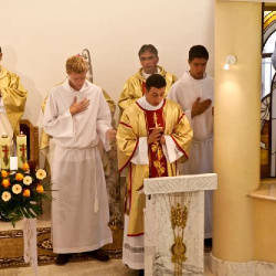 We wspólnym łamaniu chleba wzięli udział także kapłani z parafii rodzinnych sióstr neoprofesek. Parafię przy sanktuarium reprezentował ks. Proboszcz kan. Andrzej Dowal i dk. Maciej Babicki, a także schola parafialna pod przewodnictwem s. Racheli, która przygotowała oprawę muzyczną uroczystości. Piękna modlitwa śpiewem wprowadziła uczestników liturgii w podniosły charakter uroczystości i pomogła przeżyć te chwile.
