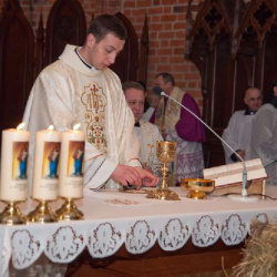 Niedzielnego przepołudnia sprawował swoją pierwszą Mszę Św. zwaną Prymicyjną w rodzinnej parafii. Udzielił wszystkim obecnym uroczystego Błogosławieństwa związanego z okolicznością przyjętych święceń. Na swoim obrazku prymicyjnym zapisał słowa św. Augustyna "Chrystusa nie ceni się wcale do momentu, kiedy zaczyna się Go cenić ponad wszystko". Życzymy, by te słowa spełniały się nieustannie w Jego drodze kapłańskiej.