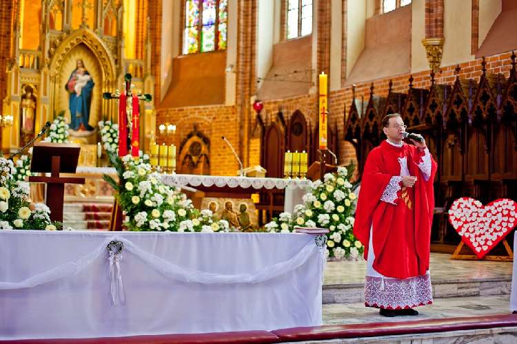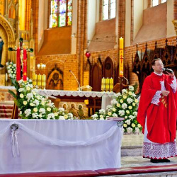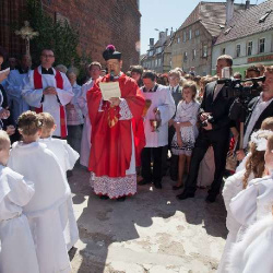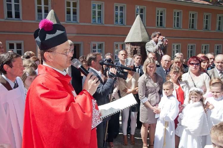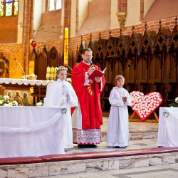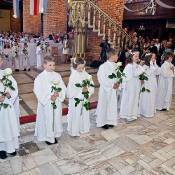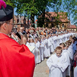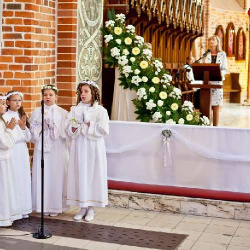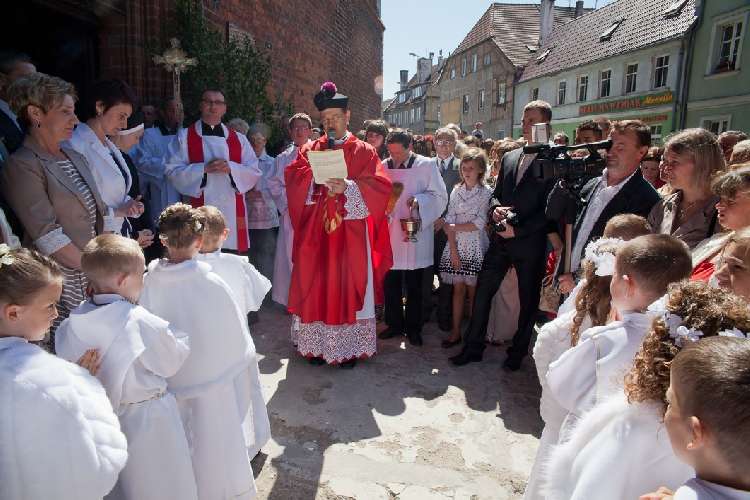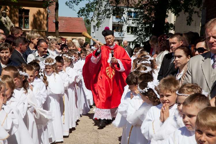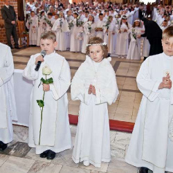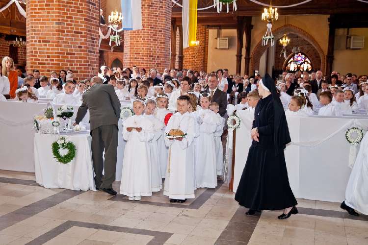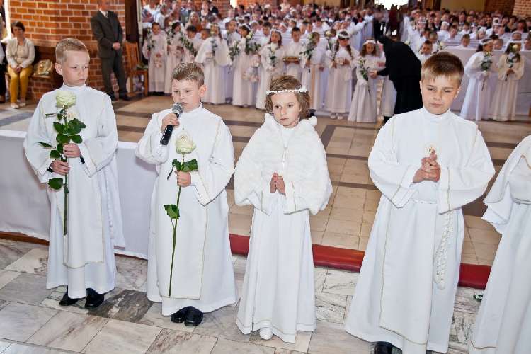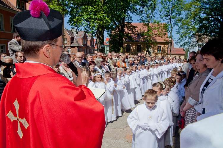 Uroczysta I Komunia Święta dzieci była wielkim wydarzeniem dla całej wspólnoty parafialnej. Ks. Proboszcz kan. Andrzej Dowal, Kustosz naszego Sanktuarium, udzielił sakramentu Eucharystii dzieciom z obydwu trzebiatowskich szkół. W homilii ks. Proboszcz trzymając monstrancję w dłoni uświadamiał słuchającym, że Jezus jest prawdziwie obecny w Najświętszym Sakramencie ale za chwilę będzie obecny w czystych sercach odświętnie ubranych dziewczynek i chłopców. Prosił rodziców, aby tę łaskę w duszach dzieci umacniali i rozwijali poprzez osobisty przykład i świadectwo życia.