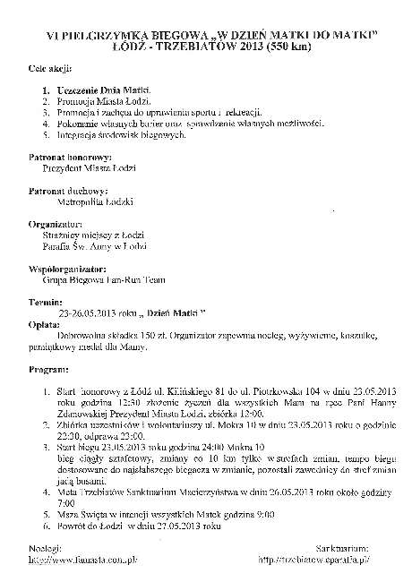 Podajemy program Pielgrzymki Biegowej z Łodzi do Trzebiatowa.