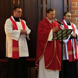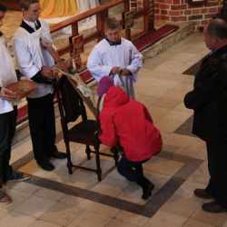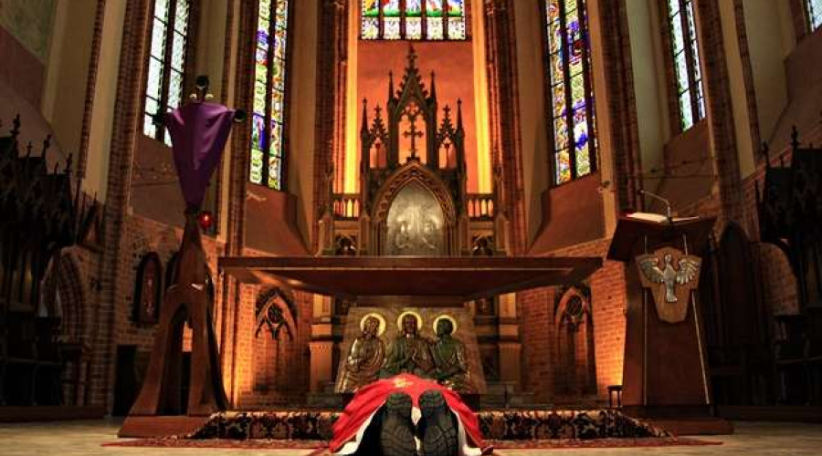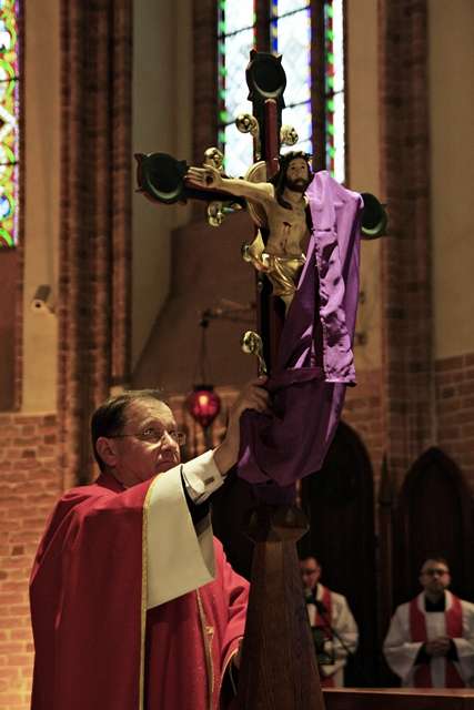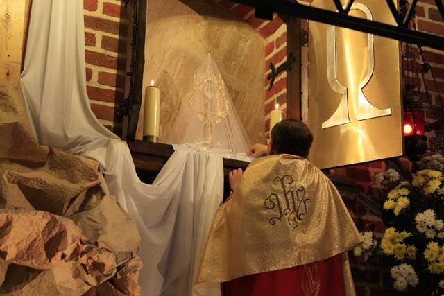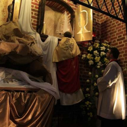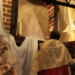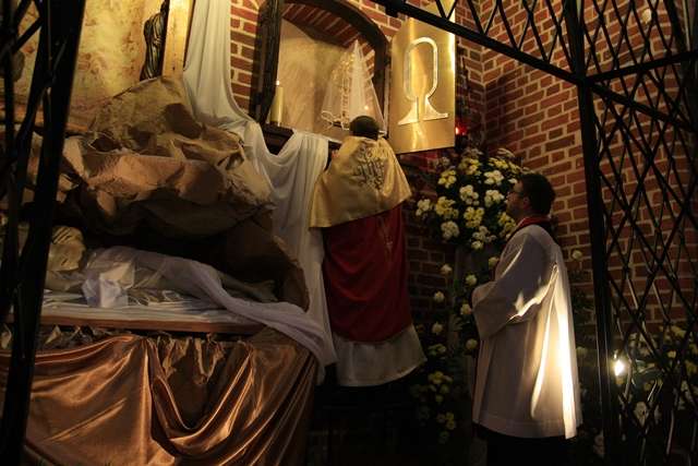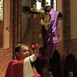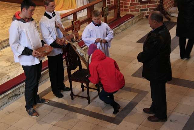 W Wielki Piątek Ksiądz Prałat Andrzej Dowal przewodniczył Liturgii Męki Pańskiej w naszym Sanktuarium. Centralnym punktem celebracji jest adoracja Krzyża Świętego. Tego dnia nie sprawuje się Mszy Świętej, a po liturgii, w uroczystej procesji, przenosi się Najświętszy Sakrament w monstrancji do symbolicznego Bożego grobu.